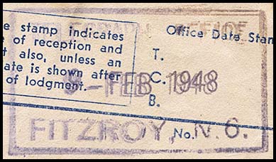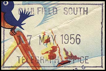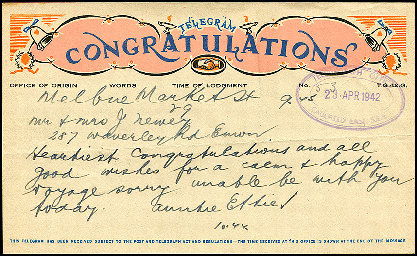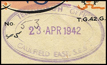 ![]() 23 April 1942 - see form below. Of the 6 known examples,all are used on Congratulations Ornamental form (AB-GCE-39C). One is dated as above (23 April) while the other five are dated 23 May 1942 and wish Edith Pollard of Waverley Road "Good luck and best wishes". |