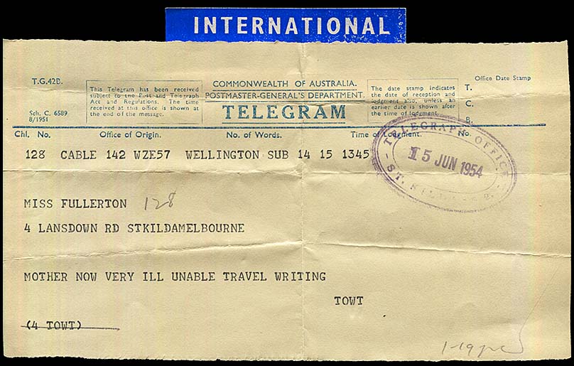 A rubber Telegraph Office date stamp (RO6-TO) was issued to the Telegraph Office.