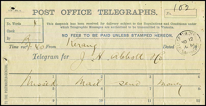 The earliest indication of the operation of the Kerang Telegraph Office is a message on a telegram delivery form (VC-DO-11C) at Sandhurst on 12 November 1887 from Kerang.