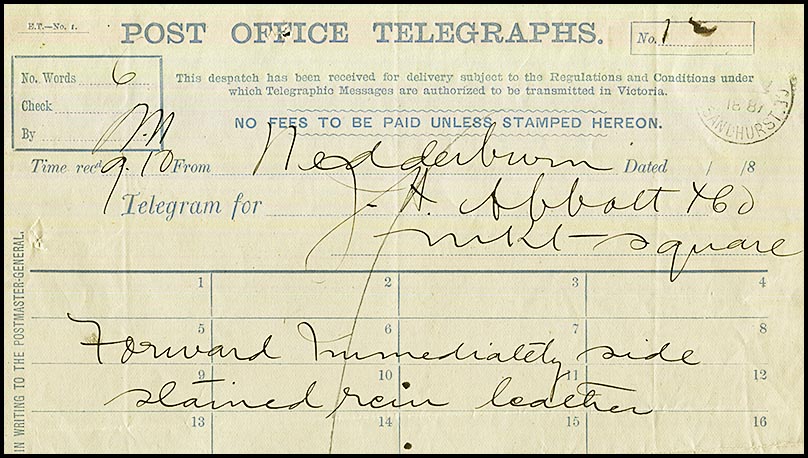 The earliest (only) telegram for Wedderburn is a message received at Sandhurst in 1887 from Wedderburn and copied onto a telegram delivery form (VC-DO-11C) .