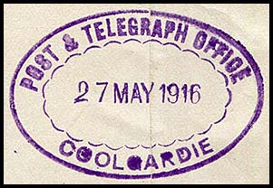 A 28 mm diameter steel date stamp inscribed TELEGRAPH OFFICE with KALGOORLIE W.A. at the base was issued with recorded use from 19 October 1927 to 8 July 1937 (Rated: RRR). A steel TELEGRAPHS date stamp has also been noted as being used in 1911 but it has not been seen (diameter 28 mm and rated RRRR). |