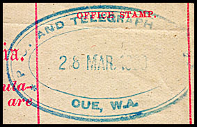 A wide variety of rubber oval date stamps were issued to Cue for use with telegraphs. A detailed review of the Cue ovals is included elsewhere.