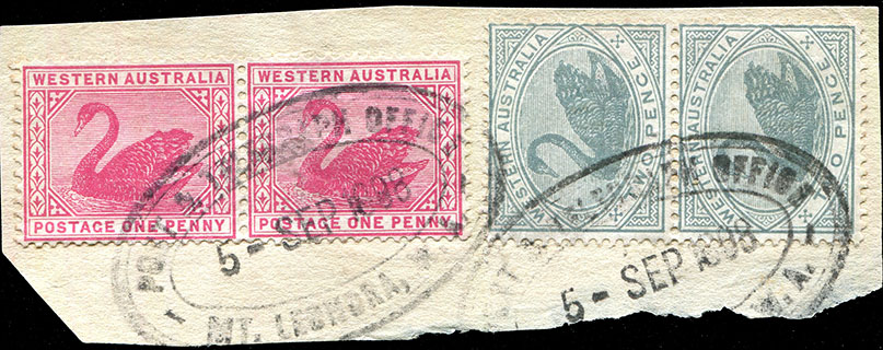 Black Flag was located in the Broad Arrow Goldfields about 10 miles south west of Broad Arrow. "Between Broad Arrow and the 'Flag we have the Dead Finish and the Fag End. At both of these places, alluvial miners are making wages. Not later than last week a 60 oz. nugget was found at Fag End. Now we've come to the Black Flag — the largest district about here — that is if one can judge from the number of men employed and the amount of machinery in course of erection. Three hundred men are employed on one mine alone. " (W.A. Record 18 July 1896). In January 1896, some rich specimens that had been recently found at the Devon Consols mine at Black Flag were on display in the window of the Commercial Bank in Coolgardie. The largest piece - named "The Joker" - was beautifully shaped and it weighed 303 ozsAbout 8.6 kgs!! - one of the largest ever found in W.A.. The "I had a dream" story of its find and the lead-up is told in the Norseman Esperance Guardian of 7 March 1896. In March 1896, the Government divided the East Coolgardie gold field into two parts. Black Flag became the centre of the new North-East Coolgardie field which comprised the districts north from the Black Flag, north and east from the I.O.U. and up to Mount Margaret. March was a busy month - almost equally as important as the above, Black Flag opened its own racecourse in March 1896 and, at the Jockey Club’s July meeting carried our under W.A.T.C. rules, the riders were ordered to wear their own colours. "The Black Flag people are also complaining that, although the telegraph line has already reached and passed their town, they are as yet unprovided with a telegraph office and have to come to the 25-Mile in order to communicate with the outside world" (Western Australian Goldfields Courier 20 June 1896). And still: "Much dissatisfaction is expressed by the residents of Black Flag on account of the delay caused in the opening of the local telegraph office. Strange as it may appear, the blame in this instance does not rest with the Telegraph Department, as the necessary material and instruments for the office were despatched from Perth several weeks ago. They have, however, been subjected to considerable delay in transit; hence the trouble" A second explanation which differs from the first of less than 2 weeks earlier: "It appears that a new telegraph line was constructed to Black Flag over a month ago, yet no office has been opened, although the district is a large one. The residents appealed to the Postmaster-General for an operator to be sent up and he, it is stated, replied that, if the residents would erect a temporary office, a man would be sent. An office at the expense of several people in the district was immediately erected and the Postmaster-General was immediately informed accordingly - but so far no reply of any kind has been sent to them. Meantime, an office has been opened at Bardoc, a smaller township further away on the same line of country" On the same day, even further salt in the wound: "People at Black Flag are bitterly complaining of the neglect of the Telegraph Department to open communication with that place. As the line goes through the town, and the people of Bardoc and Broad Arrow have already been accommodated, the people very justly feel themselves aggrieved". On 16 July, Mr, Sholl was asked by the West Australian about the Black Flag delay and replied that "the matter had already been attended to and an operator had been despatched to open the Office". The W.A. Record of 18 July published the following: "in the Arrow and Bardoc we have neither telegraph offices nor operators. The men of the Flag have, by public subscription — the great sum of £15 was collected — built a hessian building (what must its size be?) to act as a Telegraph Office, and were bold enough to forward (their informant tells me) a wire to the Minister, informing him that a telegraph office had been erected by public subscription and further, humbly inquiring if they were expected to supply the operators and instruments". 18 July is the official date of opening of the Black Flag Office. On 26 August 1896, the Broad Arrow Standard reported that "The new Post and Telegraph office at Black Flag is fast nearing completion, giving that township a settled look". And then, on 5 September 1896, the Western Australian Goldfields Courier published "Mr. Mercer, the local officer of the Public Works Department, notifies that the new Post and Telegraph Office at- the Black Flag township will be ready for occupation in a few days from the present. The structure is of wood and iron and presents no special features". On 10 July 1897, the Government Gazette listed, amongst the reserves that had been set aside, 7 acres in Black Flag for Police, Post and Telegraph, Warden's Office, public utility and the Weslean Church. In the 1898 Christmas publication of the Post and Telegraph Department, Black Flag is credited (p.20) with "a Post and Telegraph Office, Police Station and six hotels for a population of 310 with about 400 within a radius of 3 miles". The Telegraph Office was closed on 4 April 1907 but re-opened on 1 July 1907 but then closed permanently on 24 February 1908. The two largest mines in the area - Black Flag and Lady Bountiful - had closed in 1906-1907 and so the town closed down soon after. As an aside - but in the realm of philately (at least stamp duties) - the Coolgardie Mining Review of 11 January 1896 relates this remarkable historical fact: