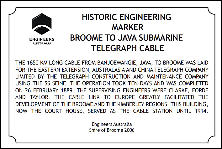 The Telegraph Office - called then Cable House - opened as Roebuck Bay on 9 April 1889 to service the third Java-Australia cable. It handled the international telegraphic traffic (mainly from Western Australia with some inter-colonial messages as well) in addition to the inter-colonial Western Australia messages through the far north.