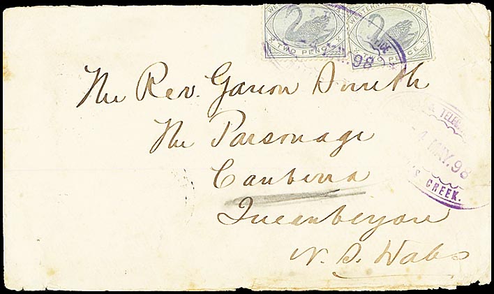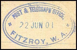 In describing Lot 1384 of the February 2013 Prestige Philately Auction , Gary Watson writes "The earliest recorded datestamp is 'FITZROY' of 3 July 1901. So the oval date stamp (to the right here) is either an earlier Fitzroy marking or, more likely, it indicates that the office was originally called Fitzroy River".