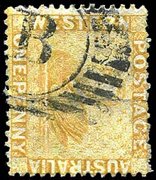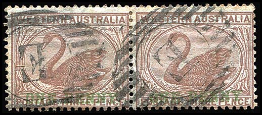 E for Eticup which closed in 1876. Broomehill opened in 1893 and used the Barred Letter obliterator. Used on a pair of 1d cinnamon Swans overprinted ONE PENNY in green in 1893. |