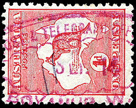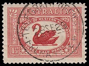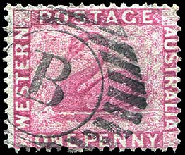 B for Bunbury on a pair of 1d carmine Swans issued in 1893. Image by courtesy of Malcolm Brown, WA. |