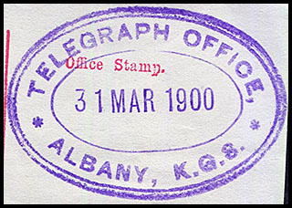 Albany was established as an outpost of NSW in 1827 to help combat any territorial ambitions the French may have. It is located on the western side of King George's Sound and the terms became to be used interchangeably to some extent. King George's Sound (from 1805) referred to the harbour while Albany was the settlement on the western shore. It is now King George Sound - because the geographical names people didn't like using possessive apostrophes (') as from the mid-1930s. The Telegraph Office opened in Albany K.G.S., combined with the Post Office, on 22 December 1872. The Albany Post Office had opened on 14 October 1834. Albany had been considered as a possible cable station in the planning of the All-Red route as well as for the cable to Mauritius and Durban. King George's Sound was the first and last port for the English mails (inbound and outbound) as well as for a quarterly shipping service to Singapore. From Albany, the mails were carried by pack horses to Perth in a journey taking about 6½ days. King George's Sound was also the last port for ANZAC troops being taken to Europe and the first Australian port for the few who returned. It was the only deepwater port in Western Australia until 1897 when Fremantle Port was established. About 16 January 1896, quadruplex instruments were fitted and tested in a new telegraph office which was then opened to the public on the following day. |