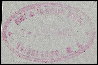 The Office was issued with a rubber oval datestamp (RO2-P&TO) which was used for only 6 weeks - allegedly from 6 December 1898 to 21 January 1899. ACE Auctions (Sale 32 lot 889) show a partial strike for 25 Oc.