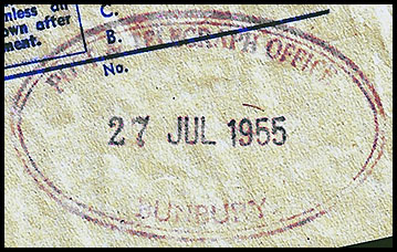 ![]() 9 August 1954. Damage to interior oval is obvious. Kevin Kealley of WA has another example dated 21 June 1954 with the same damage. |
