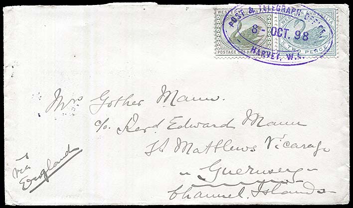 ![]() Cover from Mandurah to England 6 February 1907 with two strikes of the Mandurah oval RO6 - P&TO. |