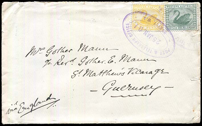 ![]() 25 January 1901 in violet. A complete RO6-P & TO strike. Franking of a ½d green and 2d yellow Swans. Used on an envelope sent to Guernesy, England. Has backstamps for SHIP MAIL ROOM. Provenance: Cowling Collection. Corinphila Sale 360, November 2025, Lot 5035. |