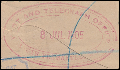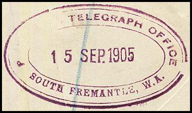 ![]() 15 September 1905. On reverse side of an OHMS cover sent from the Office of Titles to South Fremantle. |